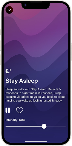Everyone knows what it feels like to wake up in the middle of the night and not be able to fall back asleep. Stay Asleep detects when you begin to stir and responds to you by delivering gentle, soothing vibrations to help keep you asleep so you wake up feeling rested with the energy to take on the day.