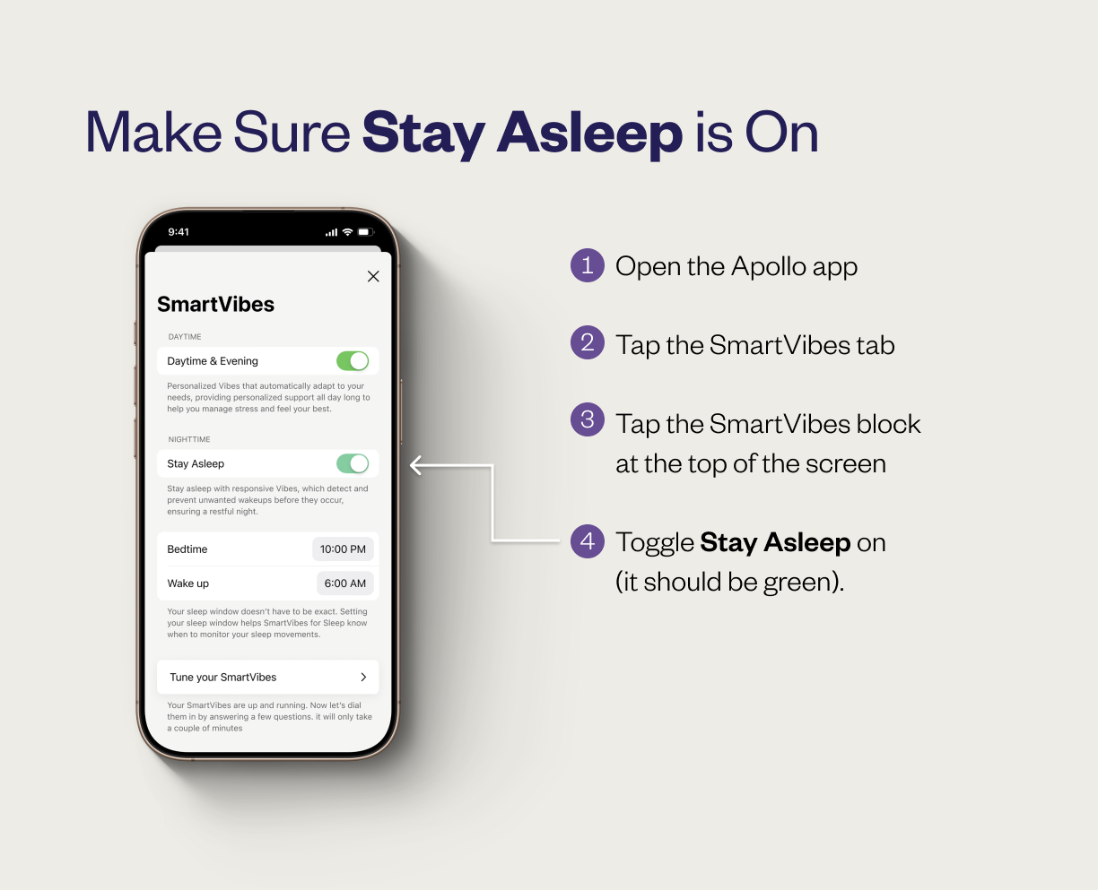 | Drift through the night with Stay Asleep, part of SmartVibes. If you wake up, Apollo automatically turns on to gently lull you back to sleep—supporting deep, restorative rest until morning. |