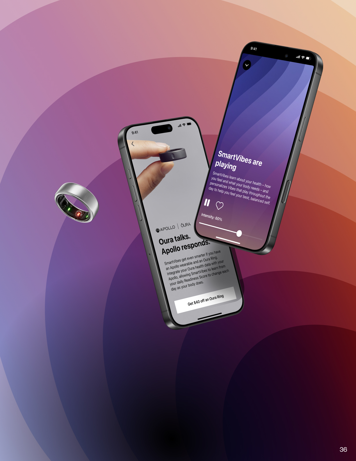 SmartVibes gets even smarter if you have an Apollo wearable and an ŌURA Ring. By connecting your ŌURA Ring with your Apollo, the SmartVibes AI customizes Vibes, based on your ŌURA data, that improve how you feel and your health biometrics automatically… day and night, optimizing your body to bounce back more quickly from stress. And you can track your progress in the ŌURA app. Browse Oura Rings
